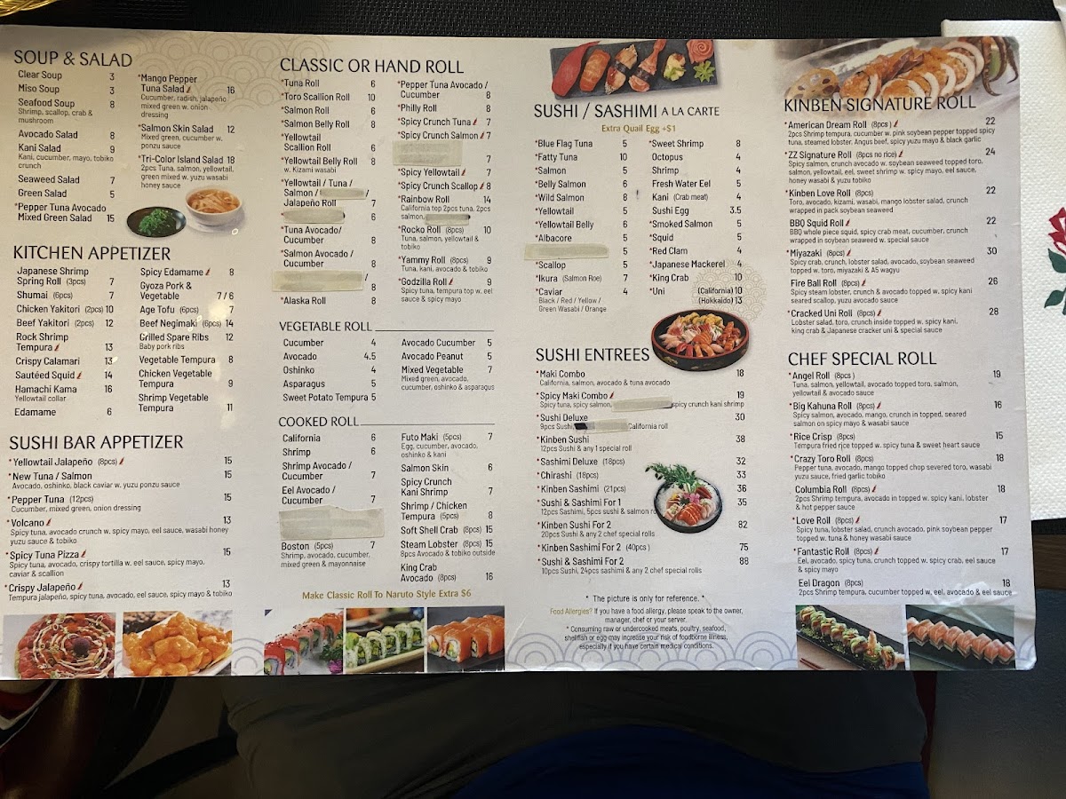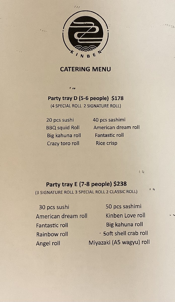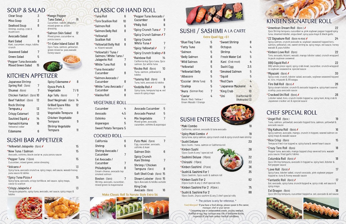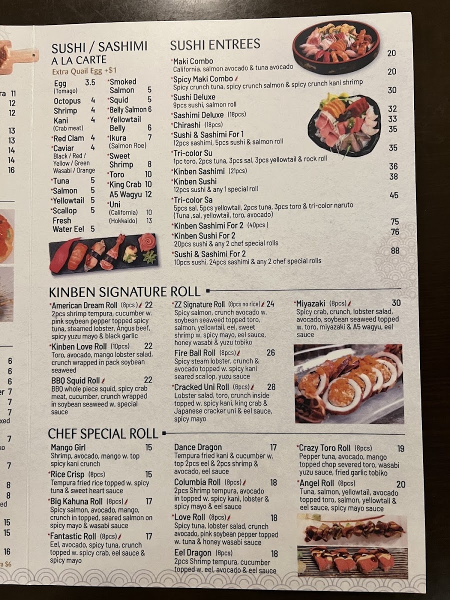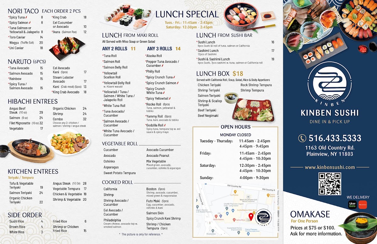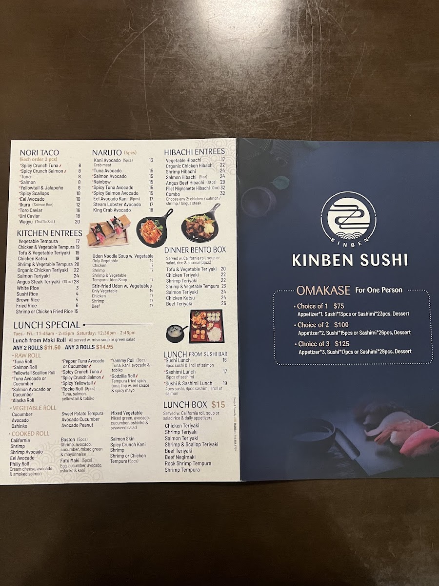 Kinben Sushi offers a diverse and exciting menu with something for everyone, from sushi enthusiasts to those craving hibachi or hearty entrées. The Chef Special Rolls stand out, with options like the Big Kahuna Roll and the Love Roll (both 8 pieces), each offering a flavorful twist on classic rolls. The Hibachi Entrées provide a variety of choices, including the Angus Beef Hibachi (10 oz) and Organic Chicken Hibachi, perfect for those seeking a filling, grilled experience. For appetizers, the Spicy Tuna Pizza and Volcano are favorites, alongside the fresh Tuna Tartare and Salmon Tartare. Kinben's Signature Rolls include unique creations such as the Cracked Uni Roll (8 pieces) and the ZZ Signature Roll (8 pieces, no rice), ensuring an unforgettable taste. The Nori Tacos bring a fun twist, offering fillings like Spicy Crunch Tuna and Wagyu with Truffle Salt. For lunch, options like the Sushi Lunch and Sashimi Lunch provide a more casual experience, while the Sushi Deluxe and Sashimi Deluxe (18 pieces) are perfect for those looking for a bountiful meal. The restaurant also offers a range of Udon & Rice dishes like Stir Fried Udon with Shrimp and Fried Rice, catering to all tastes. Whether you're looking for a sushi-packed meal or a hearty hibachi experience, Kinben Sushi delivers delicious, high-quality dishes that are sure to satisfy any appetite.