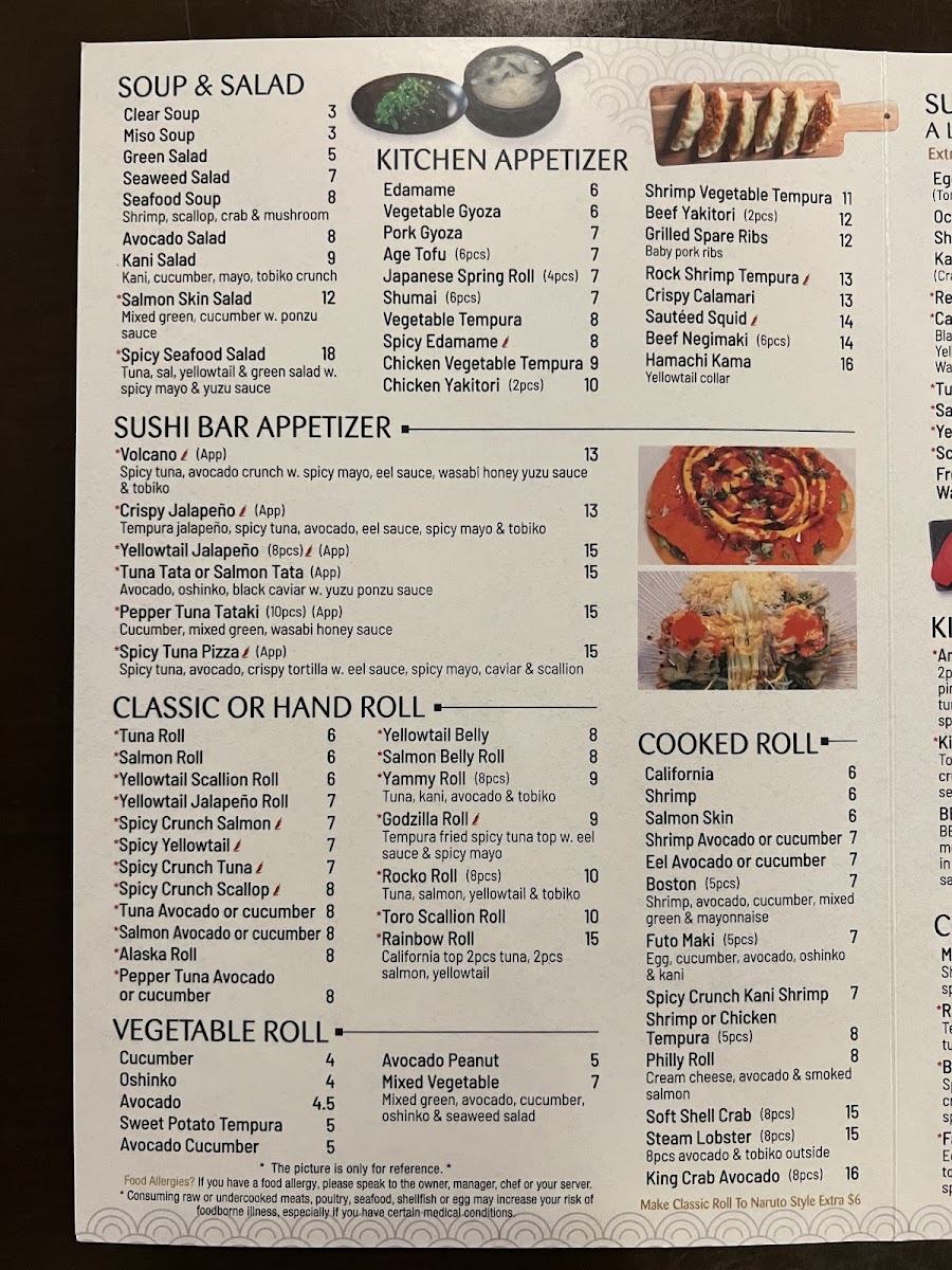 Spicy crunch tuna, spicy crunch salmon, spicy crunch kani shrimp. Consuming raw or undercooked meats, poultry, seafood, shellfish or egg may Increase your Risk of foodborne illness.